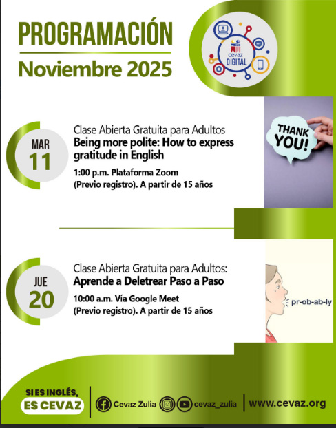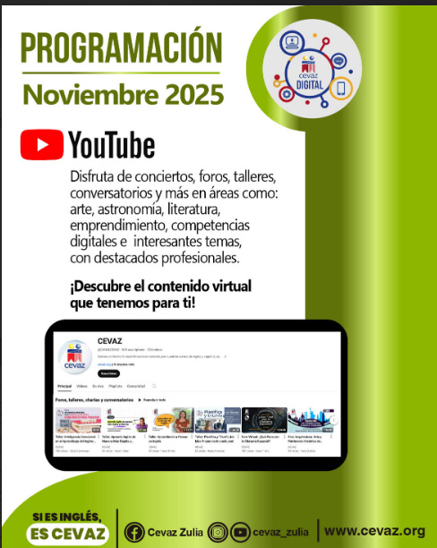 Arte y Cultura Programación de Actividades de CEVAZ Digital noviembre 14, 2025 socialite360 Como Apoyo al proceso de aprendizaje de nuestra comunidad estudiantil, CEVAZ ofrece una plataforma virtual donde podrán acceder a contenidos especialmente diseñados para potenciar sus conocimiento