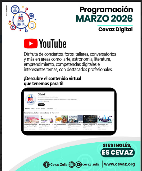 Arte y Cultura Programación de CEVAZ Digital para marzo 2026 marzo 13, 2026 socialite360 Como Apoyo al proceso de aprendizaje de nuestra comunidad estudiantil, CEVAZ ofrece una plataforma virtual donde podrán acceder a contenidos especialmente diseñados para potenciar sus conocimiento