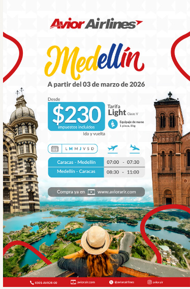 Medellín, reconocida mundialmente como la ciudad de la eterna primavera, vuelve a incorporarse al mapa de rutas internacionales de Avior Airlines. A partir del 03 de marzo de 2026, la aerolínea retoma sus operaciones aéreas desde Caracas con dos (2) frecuencias semanales, que se suman a las seis (6) actualmente operativas hacia Bogotá, ampliando las opciones de viaje y ofreciendo mayor flexibilidad a sus pasajeros.