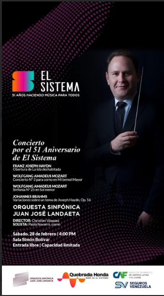 La velada, la primera de los próximos cincuenta años de El Sistema, contará con la participación especial de la cornista Paola Navarro, quien asumirá el rol solista en el Concierto N.º 3 para corno de Mozart. El repertorio se completa con la Obertura La isla deshabitada, de Franz Joseph Haydn; Sinfonía N° 25 en Sol Menor, de Wolfgang Amadeus Mozart; y Variaciones sobre un tema de Joseph Haydn Op. 56, de Johannes Brahms.