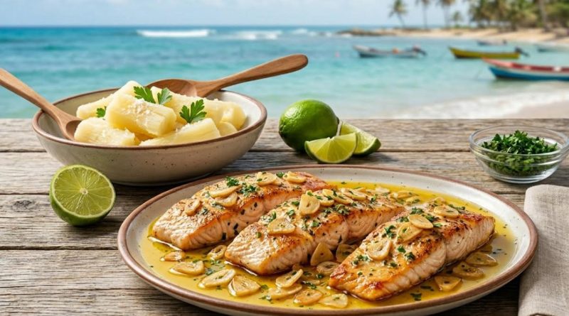 - Baña generosamente el pargo y la yuca con el mojo de ajo caliente que preparaste. Espolvorea el perejil fresco picadito por encima y sirve inmediatamente con unas rodajas de limón adicionales si lo deseas.