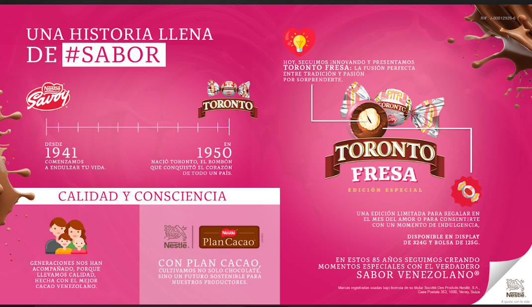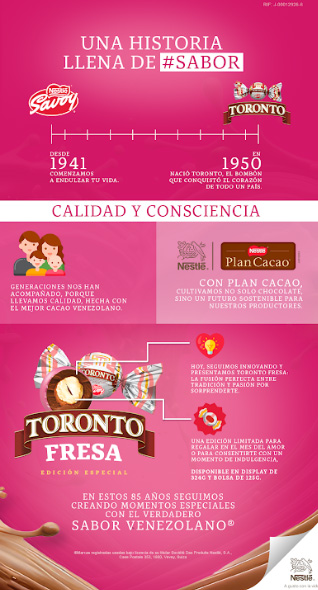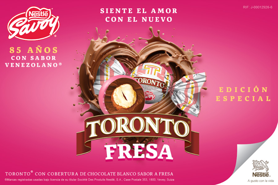 «En SAVOY® estamos orgullosos de nuestra historia y de cómo hemos acompañado al venezolano en sus momentos más dulces durante 85 años. Iniciar este aniversario con la innovación de uno de nuestros productos más emblemático, como lo es TORONTO®, es la manera de agradecer la fidelidad de los consumidores, brindándoles calidad y sabor venezolano en una edición que encaja perfectamente con el espíritu de San Valentín», destacó Daniela Serpa, Directora del Negocio de Confites en Nestlé Venezuela.