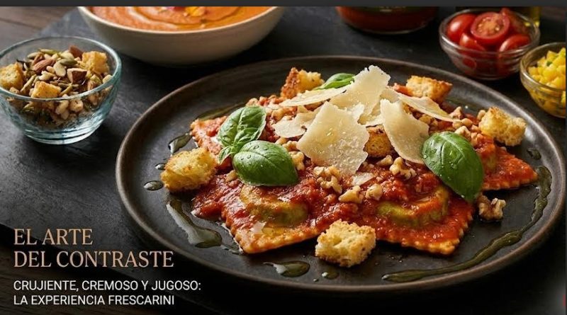 ü Efecto: El crujiente del pan o el fruto seco rompe la densidad de la salsa de tomate, haciendo cada bocado más dinámico.