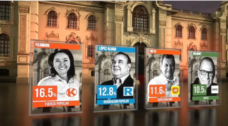 Contabilizadas 54,32 % de las 92 766 actas electorales al mediodía de este lunes 13, Fujimori, de Fuerza Popular, marchaba adelante con 16,95 % de los votos, seguida de López Aliaga, de Renovación Popular, con 14,44 %.