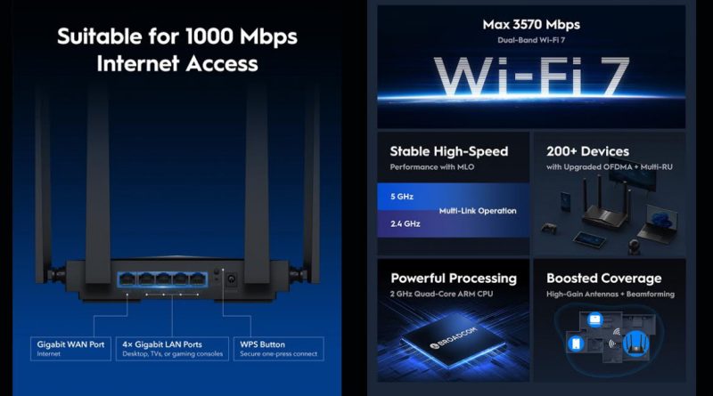 – Wi-Fi 7 Dual-Band: velocidad máxima agregada de 3570 Mbps